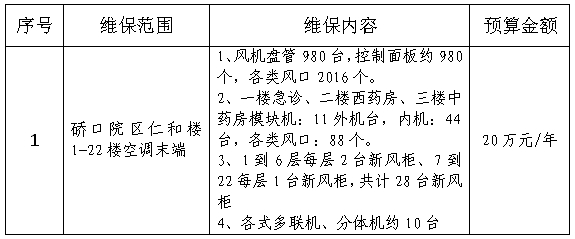 根据我院硚口院区仁和楼中央空调末端维保需求,拟立项招标仁和楼中央空调维保项目,现将相关要求公布如下,欢迎有意向、符合条件的企业积极报名。