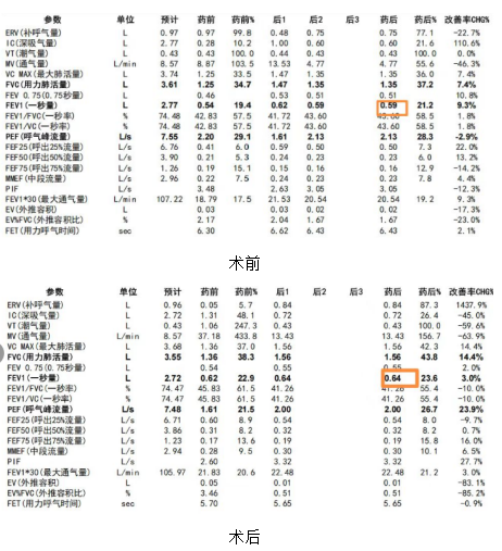 麻醉苏醒后,周爹爹说:“手术一点感觉没有,不疼也没伤口,这么快就做完了,真是先进!”,术后14天,患者自觉喘气症状较入院前有所改善。仅术后2周,患者复查肺功能一秒量提升至0.64L,术后自行活动90米,较前轻松且患者自觉行走感受明显好转。随着术后肺部修复及功能恢复,患者气促症状及活动耐量将进一步改善。