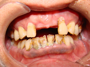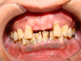 患者,黄某。男,55岁,主因上颌前牙缺失要求镶牙。临床检查:8,9缺失,10松动三度,牙周退缩。下前牙软垢及结石存在。辅助检查:10牙片显示根尖周暗影,不明透光影。诊断:肯氏四类牙列缺损;牙周炎;10根尖周炎。处理:10一次性根管治疗,上下牙周洁治。2天后上颌6,7,10,11备牙取模。7天后修复体试戴,粘固。患者满意。治疗时间10天,就诊三次。