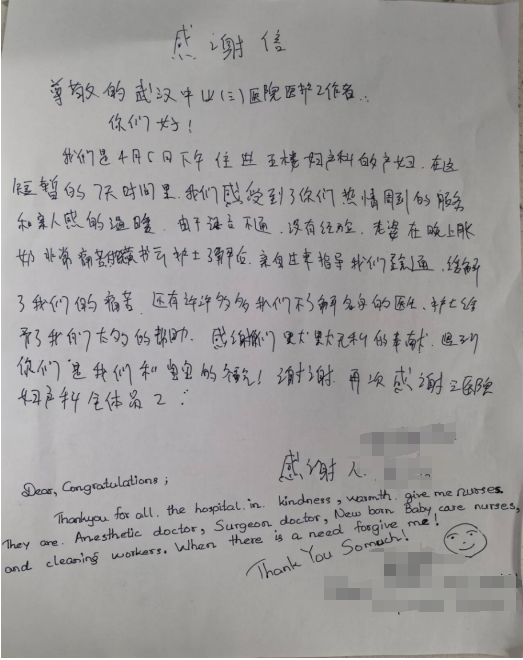 “住院的这几天非常感谢医护人员的照顾。我们是第一次当爸妈,没有经验,宝妈在涨奶时非常痛苦,在护士帮忙挤奶和疏通后,解除了奶涨的困扰。妇产科整个团队都非常优秀,医术精湛,服务态度也特别好,非常感谢大家!”今天,新手爸妈袁先生和自己缅甸籍的爱人在出院之际给betway巴塞罗那(湖北省中山医院)妇产科医护团队送上手写感谢信来表达自己的感激之情。